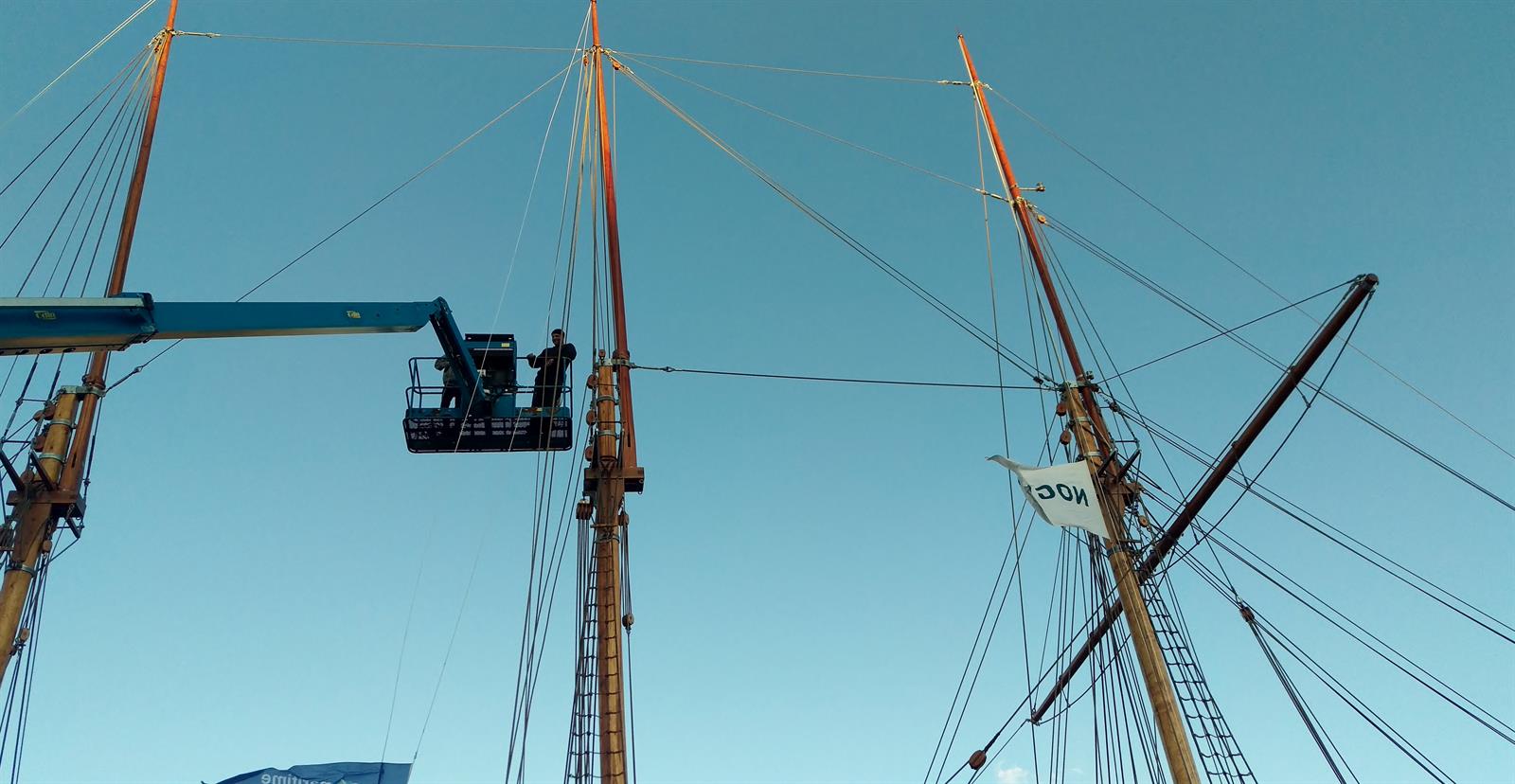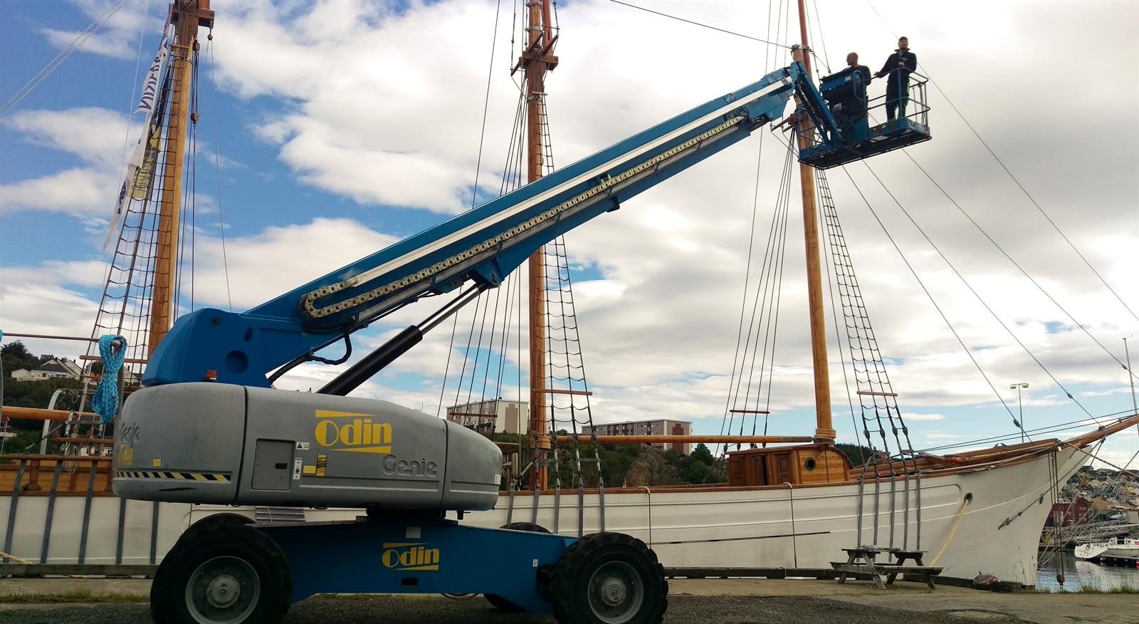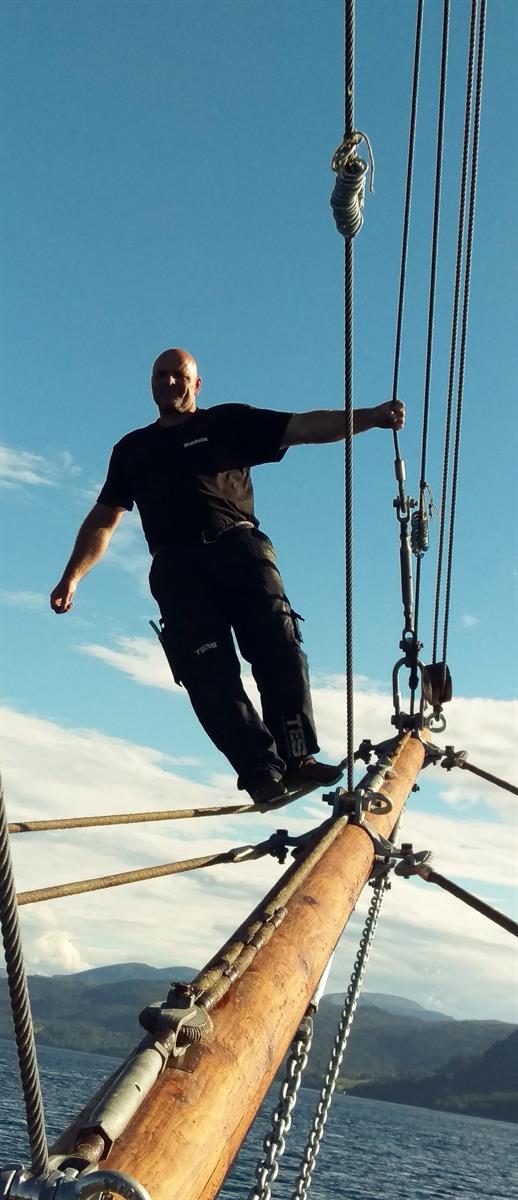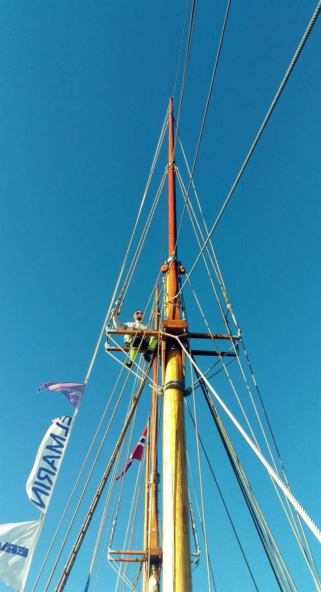 Mange av arbeidsoperasjonene har vært tunge og kronglete men takket være liften har alt gått som smurt. Kan ikke akkurat klage på utsikten oppe i riggen heller!